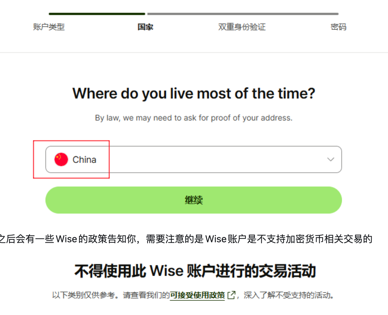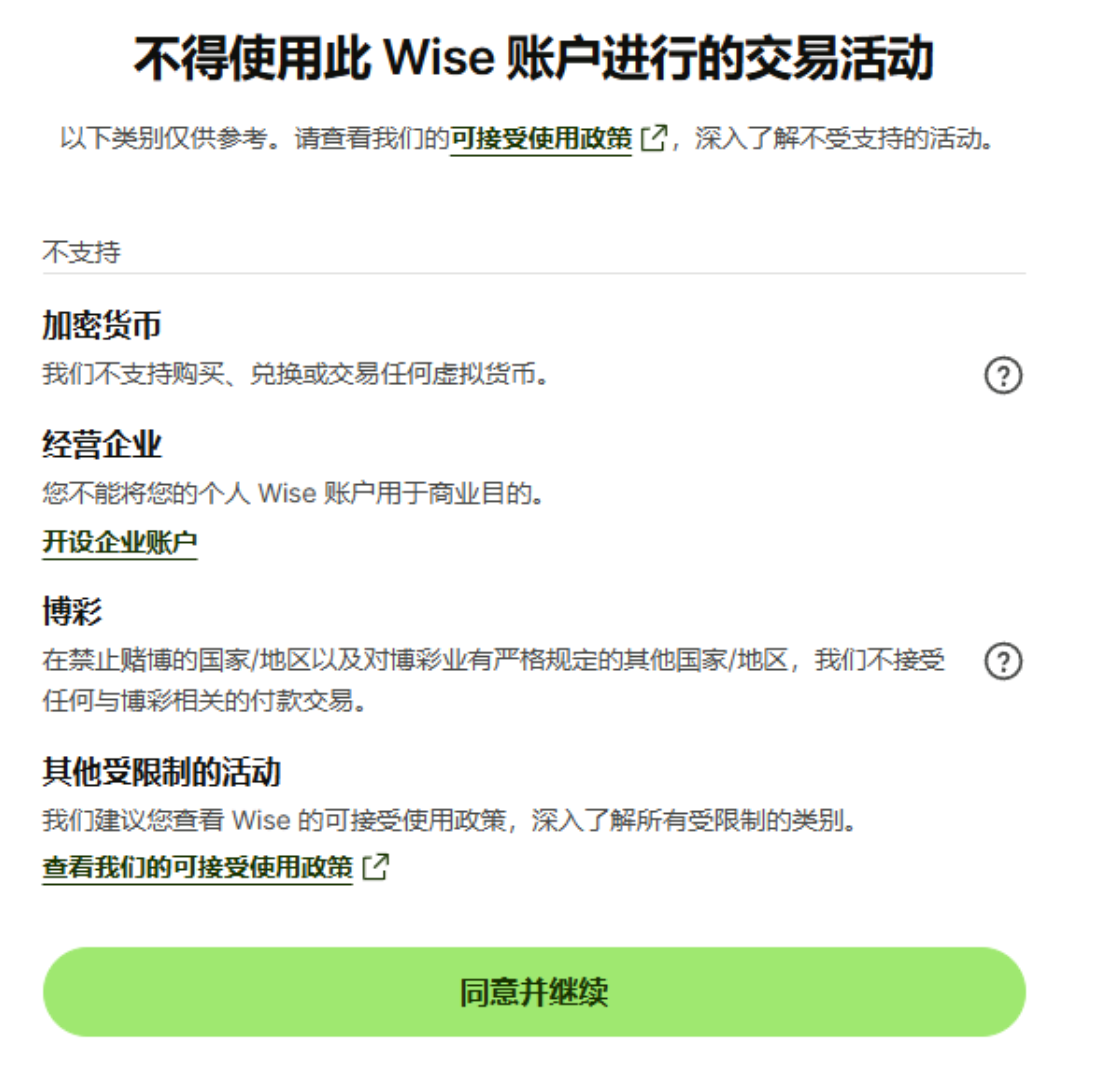 4.在账户开通过程中,Wise 会陆续展示相关的合规与使用规则。其中一点需要注意:Wise 明确不支持加密货币相关交易。