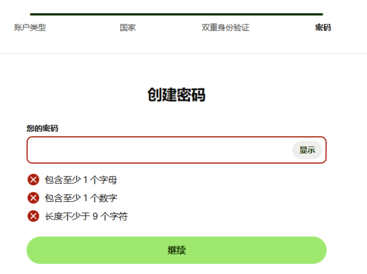 6.手机短信验证成功后,就可以创建密码了,它的密码要求挺复杂的,建议用个文本把密码记着防止后面忘记